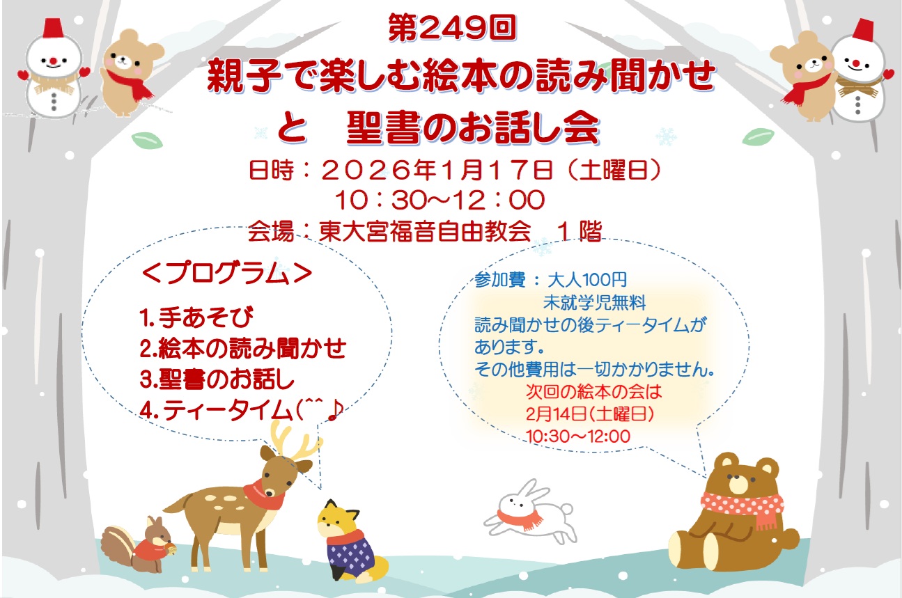 第249回親子で楽しむ絵本の読み聞かせと聖書のお話 投稿日 2026年1月11日 著者 h-omiya-efc カテゴリー 未分類 画面をタップすると印刷用のページが表示されます。 この記事を書いた人 h-omiya-efc 記事一覧